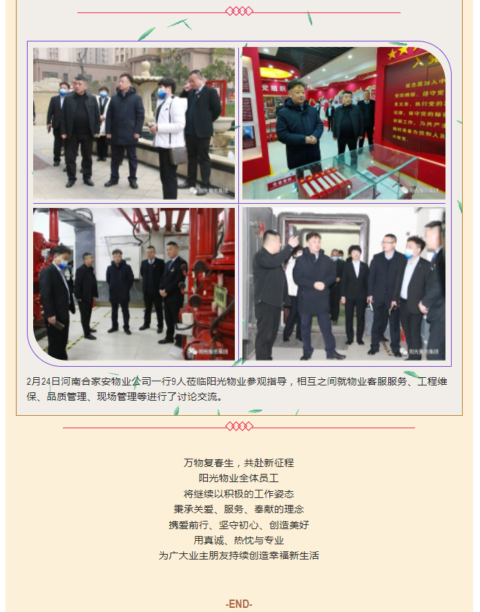 陽光物業(yè)成立于2003年5月,專注物業(yè)服務(wù)行業(yè)20余載,陽光物業(yè)現(xiàn)為河南省物業(yè)管理協(xié)會副會長單位、商丘市物業(yè)管理協(xié)會副會長單位,公司注冊資金1020萬元,陽光物業(yè)連續(xù)多年被河南省及商丘市評為先進企業(yè)、優(yōu)秀企業(yè)。