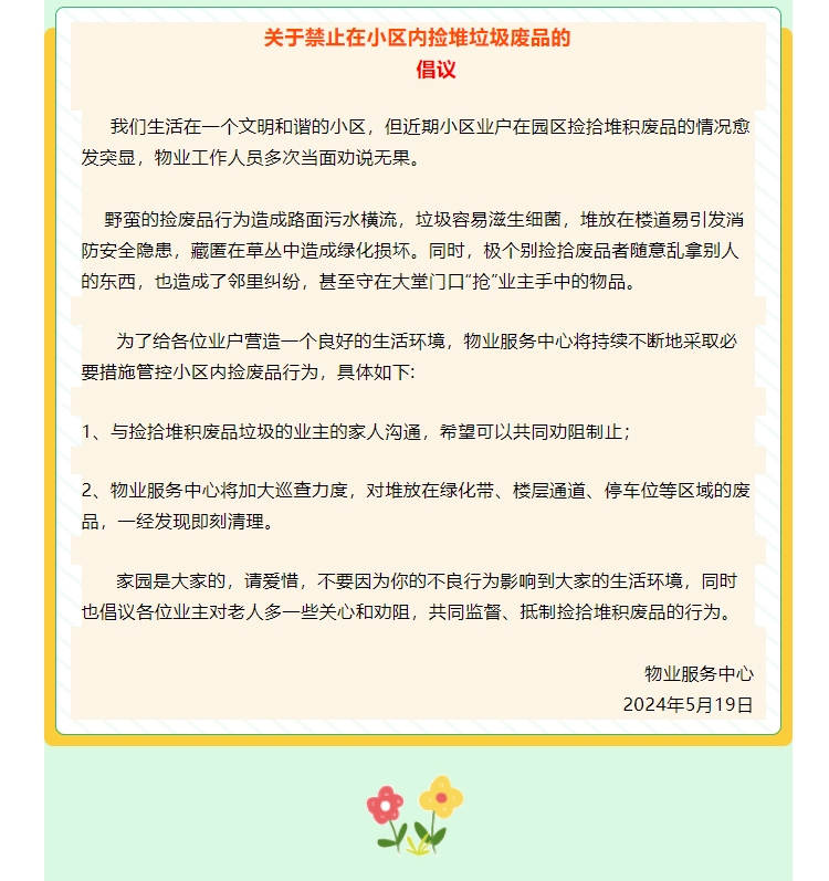 共創(chuàng)文明社區(qū)|嚴(yán)禁在小區(qū)內(nèi)撿拾堆積垃圾廢品的倡議